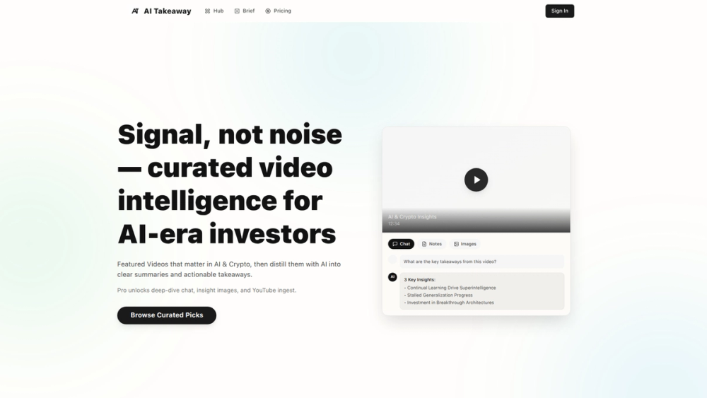 AI Takeaway is a specialized learning hub designed to accelerate understanding of complex topics in artificial intelligence and investing. It operates on a simple yet powerful premise: to cut through the noise of endless online video content by providing curated, AI-driven summaries. The platform selects high-impact videos that matter in the AI and crypto spaces and distills them into concise summaries, actionable takeaways, and interactive chat-ready transcripts. This allows users to grasp key information in minutes, not hours.