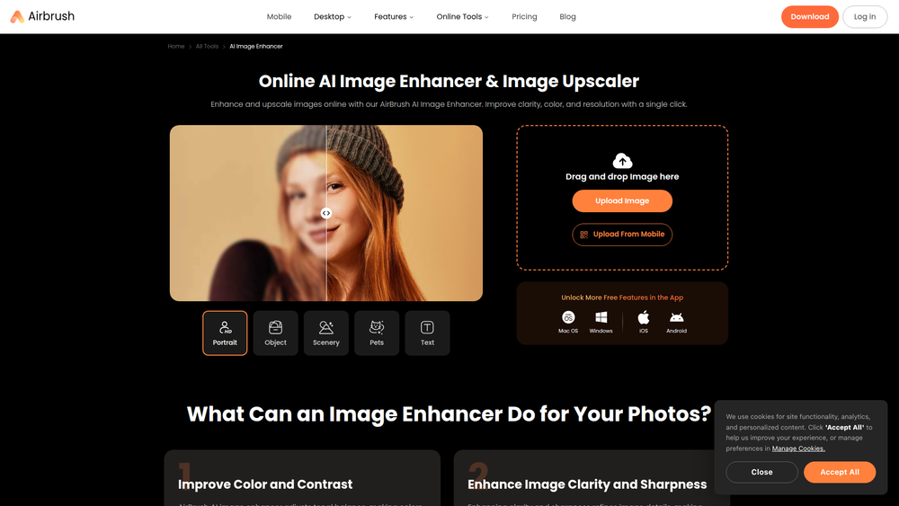 Airbrush is optimized for a variety of image types. The tool has specific modes for enhancing portraits, objects, scenery, pets, and even images with text to ensure the best possible outcome for each category.