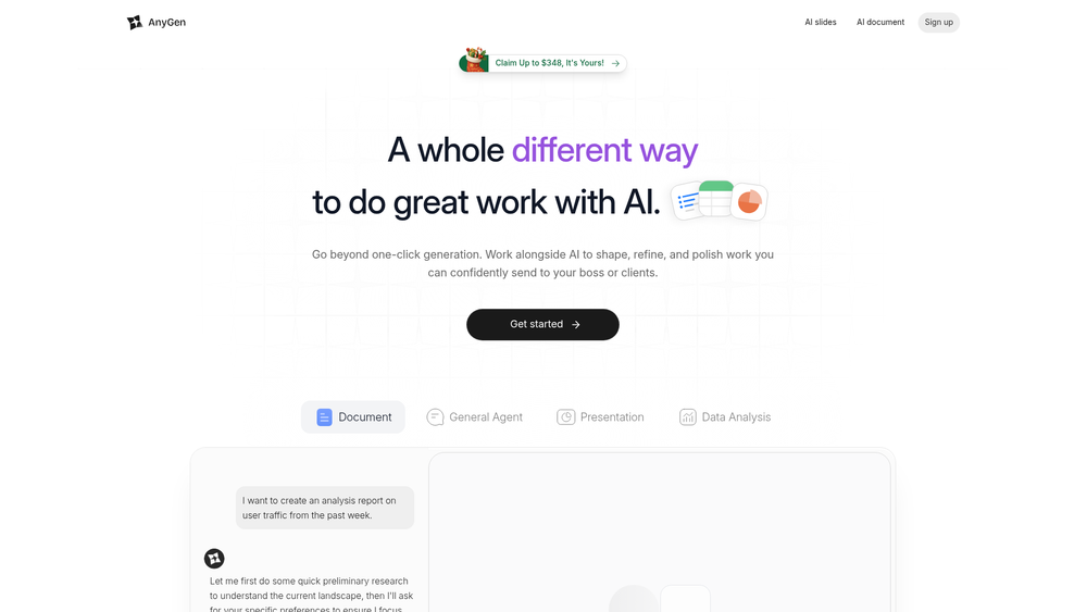 The primary benefit of AnyGen is its ability to boost productivity and foster creativity through intelligent automation and real-time collaboration. It is designed for a diverse range of users, including marketing teams crafting campaigns, business analysts preparing reports, educators developing course materials, and any professional group needing to turn ideas and data into polished, presentable content. AnyGen's value lies in its capacity to transform complex tasks into manageable workflows, enabling teams to generate high-quality output faster than ever before.