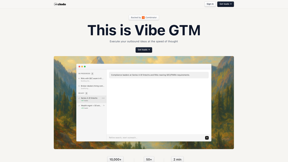 Clodo, also known as Vibe GTM, is an AI-driven outbound engine designed to bridge the gap between complex Ideal Customer Profiles (ICPs) and actionable lead lists. Instead of wrestling with rigid database filters, users can describe their target audience in plain English—such as "compliance leaders at Series A fintechs nearing SEC requirements"—and let the platform's AI agent scour the web for matches. Backed by Y Combinator, the tool focuses on "hyper-specific" prospecting, ensuring that sales teams aren't just hitting high volumes, but are reaching the right people at the right time.