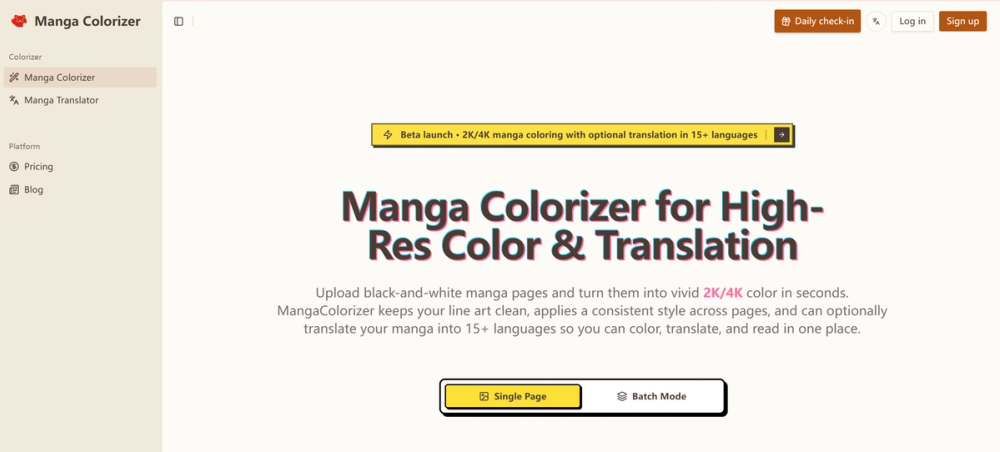 Manga Colorizer is an AI tool that instantly colors black-and-white manga and translates it into 15+ languages while keeping the original layout and art style.