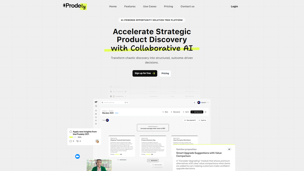 The primary benefit of Prodely is its ability to bring structure and clarity to the product development lifecycle. It is targeted at product managers, user researchers, and development teams who need to make informed, data-driven decisions. The platform acts as an intelligent teammate, automating the analysis of customer data and visually mapping out strategic paths using the Opportunity Solution Tree framework. This makes it an invaluable tool for any organization looking to build products that truly resonate with customer needs and achieve business goals.
