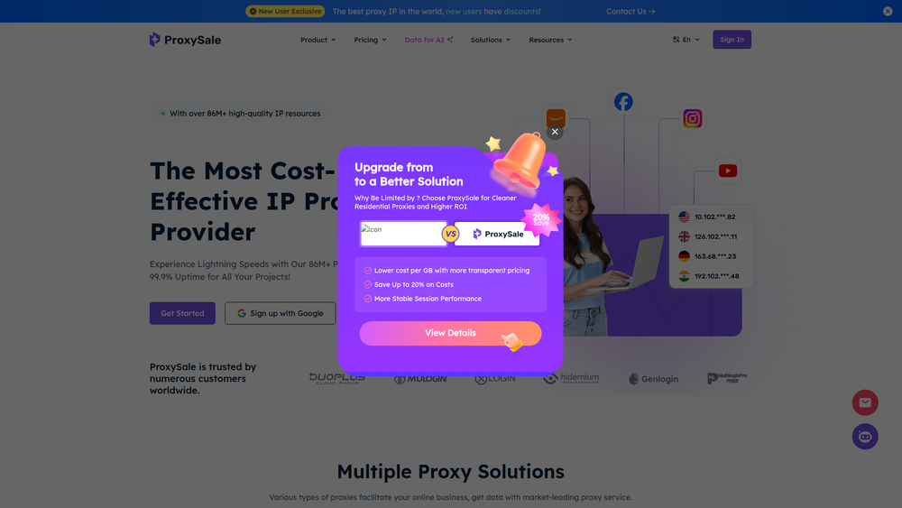 Proxysale is a premium provider of high-performance proxy services, offering a diverse range of solutions including residential, datacenter, and ISP proxies. The core purpose of the service is to enable users to access and collect public web data anonymously, reliably, and without geographical restrictions. By routing internet traffic through a vast network of global IP addresses, Proxysale helps bypass IP blocks, CAPTCHAs, and geo-fencing, making it an essential tool for data-driven operations.