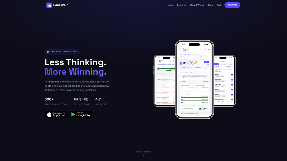 RaceBrain - Horse Racing Tips is a sophisticated mobile application designed to transform how bettors approach the track. By leveraging a database of over 500 races daily, the platform provides a rigorous analytical framework for UK and Irish horse racing. It serves as a digital bridge between raw racing data and actionable betting intelligence, allowing users to move past generic tips and instead develop their own informed strategies based on hard evidence.\n\nWhether you are a seasoned punter looking for an edge or a casual fan trying to understand the form, RaceBrain streamlines the complex variables of racing. The app synthesizes vast amounts of historical data, track conditions, and performance metrics into a clean, navigable interface. This shift from reliance on external tipsters to personal data analysis empowers users to make more confident decisions at the bookmaker.\n\n## Key Features\n- In-Depth Statistical Database: Access granular data points on horses, jockeys, and trainers to build a complete picture of every race.\n- Advanced Form Analysis: Utilize historical performance logs and detailed form guides to identify which horses are currently peaking.\n- Live Race Updates: Stay current with real-time notifications, odds fluctuations, and instant results as they happen.\n- Track-Specific Insights: Evaluate how different course layouts and ground conditions impact specific runners.\n- Trainer & Jockey Combinations: Identify high-percentage partnerships and track the current win-rates of top stables.\n- UK & Ireland Coverage: Comprehensive access to all major and minor race meetings across the United Kingdom and Ireland.\n- Visual Prediction Tools: View probability-based outcomes and predictions generated from the app's internal data models.\n- User-Friendly Dashboard: A streamlined interface that makes complex data accessible without overwhelming the user.\n\n## How to Use RaceBrain - Horse Racing Tips\n1. Install the App: Download RaceBrain for free from either the Apple App Store or Google Play Store.\n2. Select a Meeting: Open the app to view the daily schedule of UK and Irish race meetings and select a specific race card.\n3. Analyze the Field: Tap on individual horses to view their career statistics, recent form, and specific course history.\n4. Check Professional Metrics: Review trainer/jockey stats and track insights to see if the current conditions favor your selection.\n5. Compare Predictions: Look at the app’s data-driven predictions to validate your own findings or spot overlooked value.\n6. Track Your Selections: Save your favorite horses and receive notifications when they are scheduled to run or when results are posted.\n\n## Use Cases\n- Professional Research: Serious bettors use the app to conduct deep-dive research into horse pedigree and trainer patterns before placing high-stakes wagers.\n- Casual Race Day Companion: Fans attending the track can quickly pull up form guides on their phones to make more informed choices between races.\n- Value Hunting: Analysts use the statistical overlays to find value where the data suggests a horse has a higher chance of winning than the current bookmaker odds imply.\n- Stable Tracking: Horse enthusiasts can track specific trainers or stables to monitor their performance throughout the season.\n\n## Pricing\nRaceBrain is free to download and provides access to a wealth of basic racing data. For users seeking more advanced analytics or specialized tools, optional premium upgrades are available within the app. Check the official website or app store listing for current subscription details.\n\n## FAQ\n\n### What is RaceBrain - Horse Racing Tips?\nIt is a data-analysis mobile app that provides comprehensive statistics and predictions for horse racing in the UK and Ireland.\n\n### Is RaceBrain - Horse Racing Tips free to use?\nYes, the app is free to download and use, though some advanced features may require a premium subscription.\n\n### Does it cover international racing?\nCurrently, the app focuses specifically on providing deep coverage for all UK and Irish race meetings.\n\n### Can I use it on my tablet?\nYes, the app is optimized for both smartphones and tablets on iOS and Android platforms.\n\n### How many races are analyzed?\nThe app analyzes over 500 races daily, providing a massive dataset for users to explore.\n\n### Does the app provide live streaming?\nNo, RaceBrain focuses on data analysis and tips; it does not provide live video broadcasts of the races.