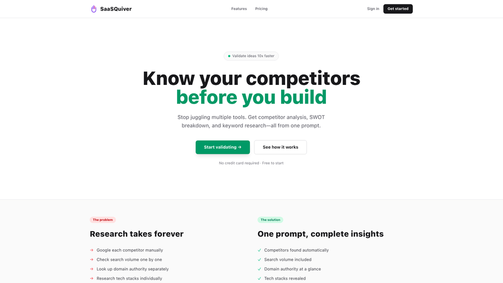 - Validate SaaS ideas instantly with competitor analysis, SWOT, and keyword research from one prompt.