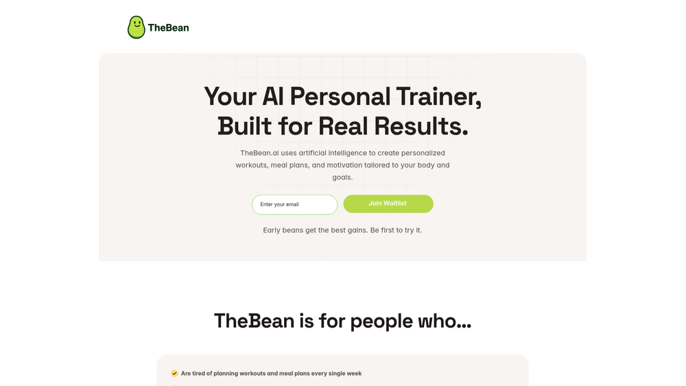 TheBean.AI is an AI-powered fitness platform that acts as your personal trainer, meal planner, and motivational coach. It uses three specialized AI agents (TrainBean, EatBean, CoachBean) to create a unified and adaptive plan for your fitness goals.